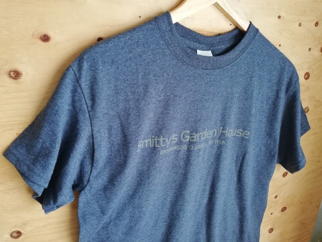 霜降り調のヘザーネイビーのボディに、ウォームグレーでロゴをプリントしました。